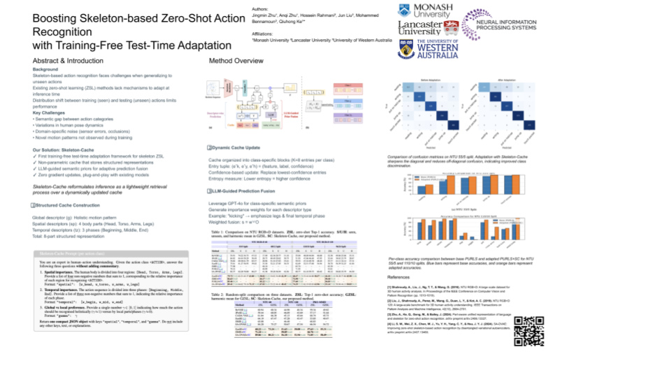 Extensive experiments on NTU RGB+D 60/120 and PKU-MMD II demonstrate that Skeleton-Cache consistently boosts the performance of various SZAR backbones under both zero-shot and generalized zero-shot settings. The code is publicly available at