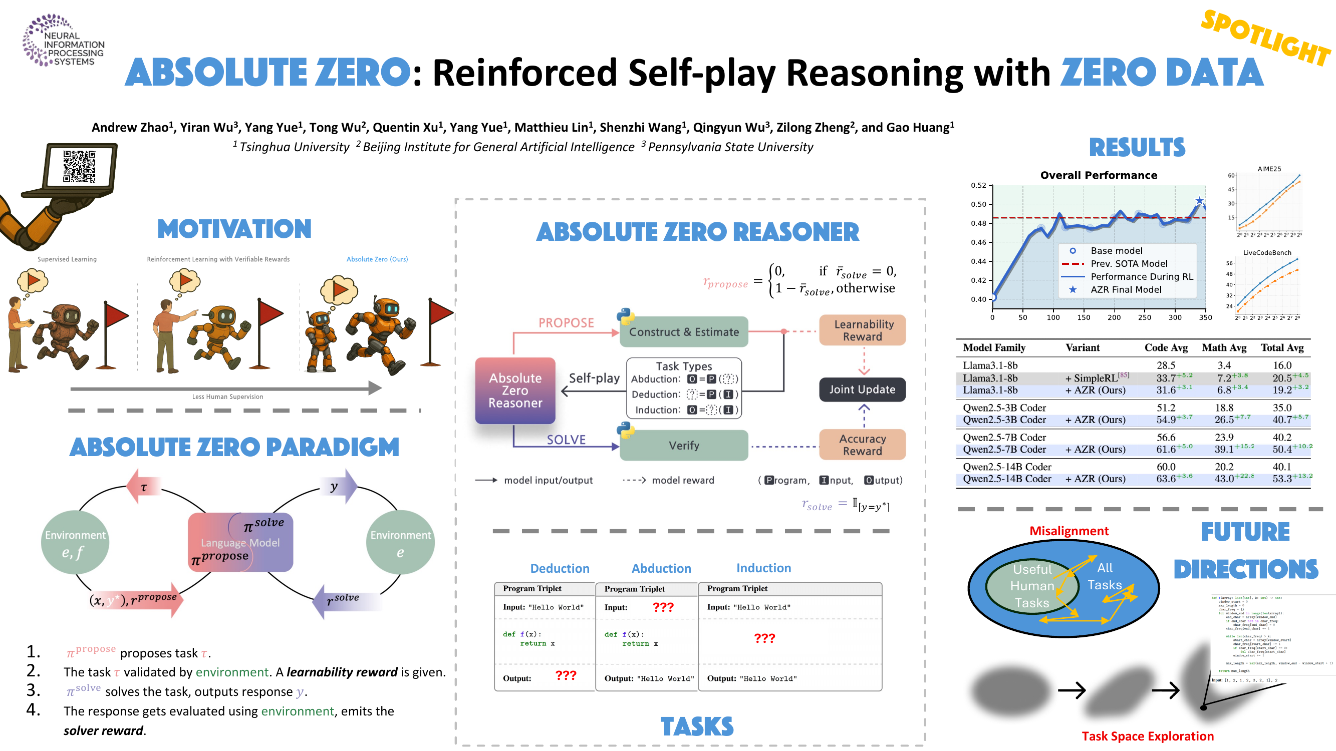 Despite being trained entirely without external data, AZR achieves overall SOTA performance on coding and mathematical reasoning tasks, outperforming existing zero-setting models that rely on tens of thousands of in-domain human-curated examples. Furthermore, we demonstrate that AZR can be effectively applied across different model scales and is compatible with various model classes.