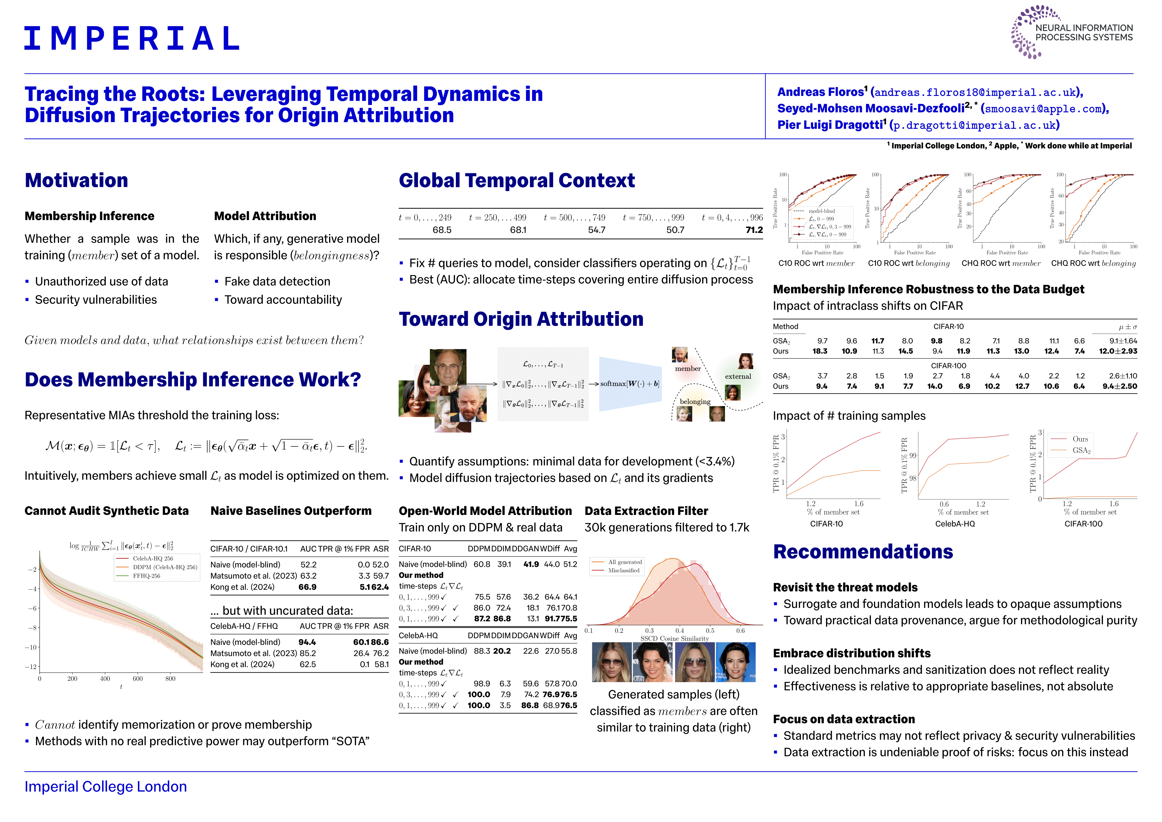 More fundamentally, we expose critical flaws in current membership inference practices by showing that representative methods fail under distribution shifts or when model-generated data is present. For model attribution, we demonstrate a first white-box approach directly applicable to diffusion.
