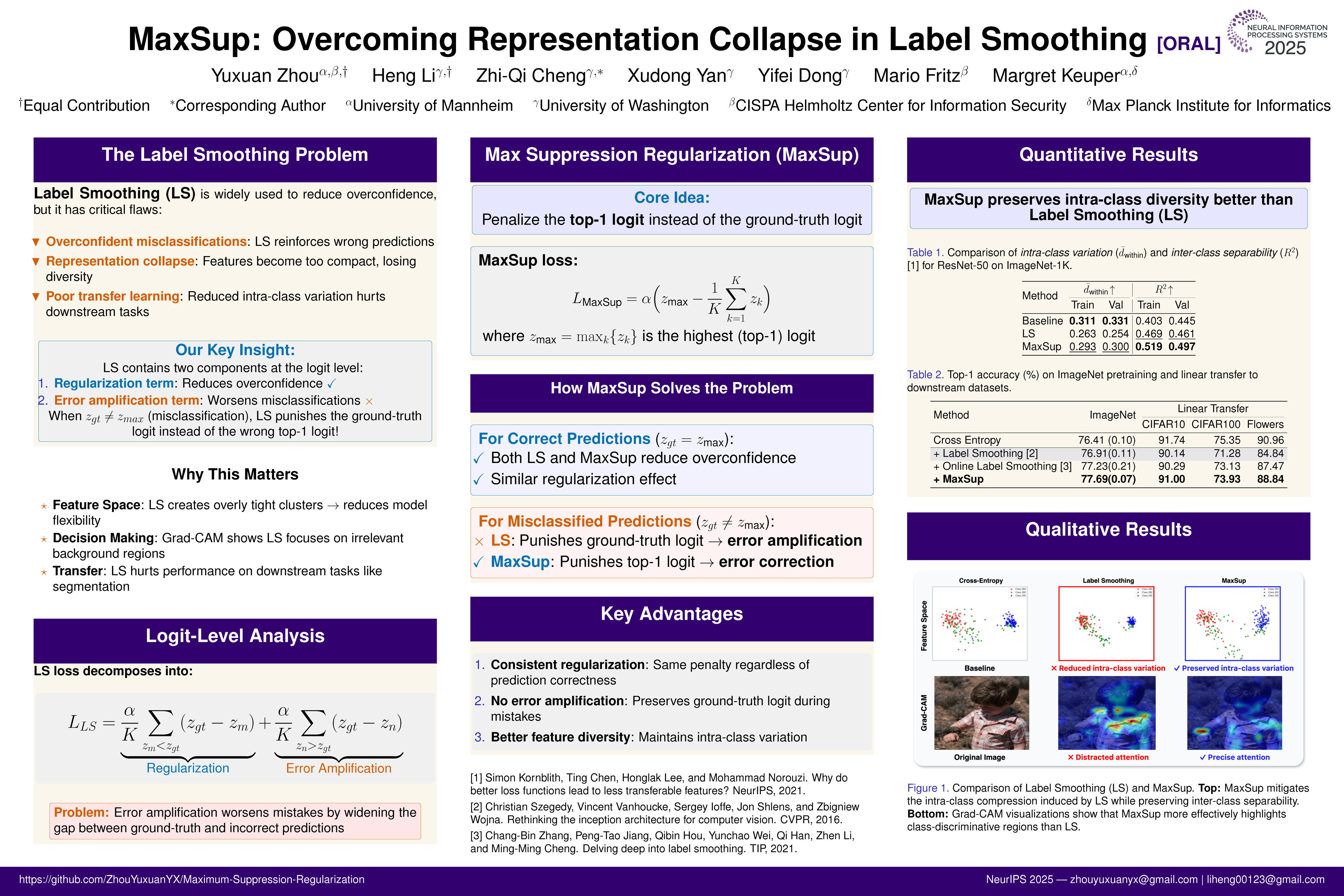 Through extensive feature-space analyses, we show that MaxSup restores intra-class variation and sharpens inter-class boundaries. Experiments on large-scale image classification and multiple downstream tasks confirm that MaxSup is a more robust alternative to LS.