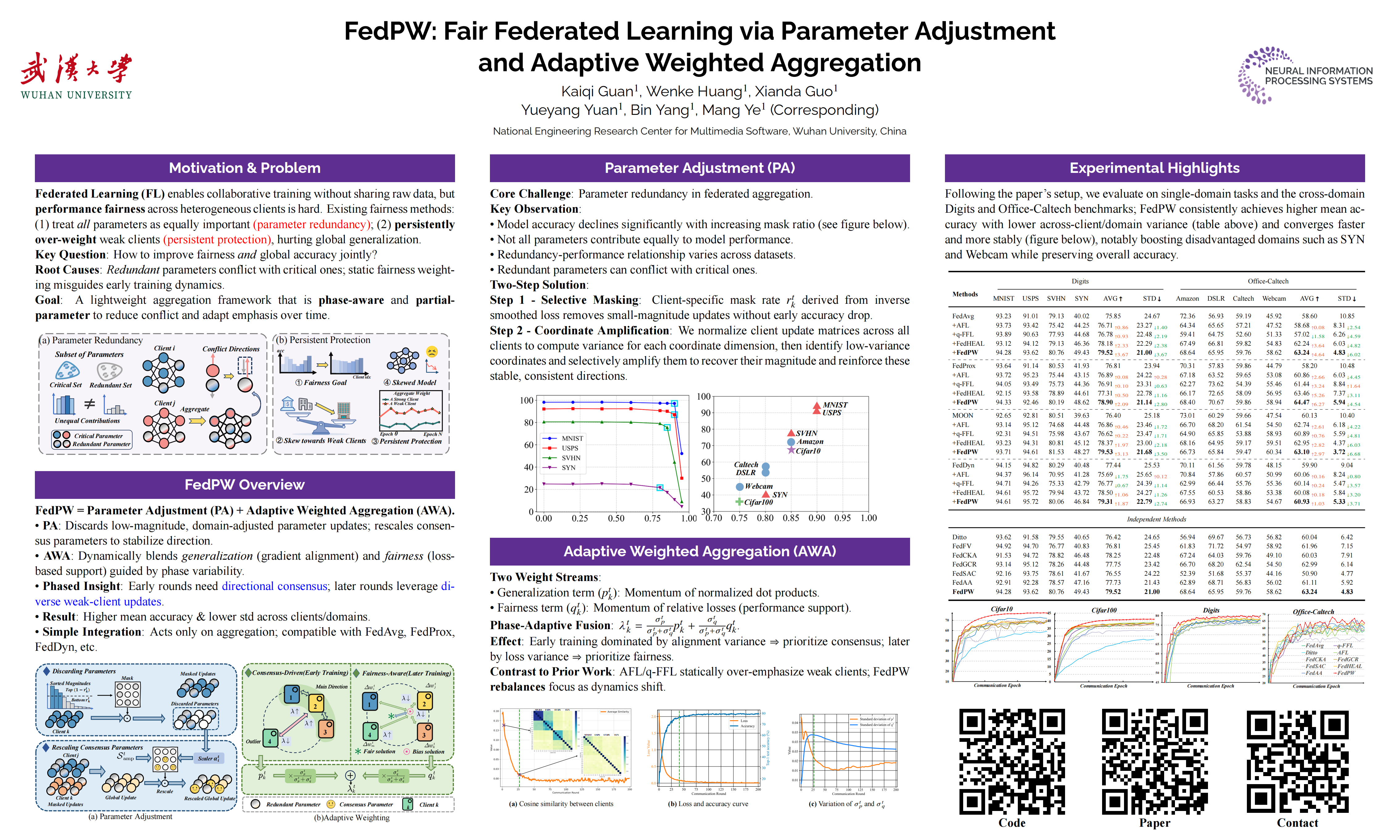 - Second, we observe that the federated training process exhibits distinct characteristics across different phases. We propose a dynamic aggregation strategy that adaptively weights clients based on local update directions and performance variations.