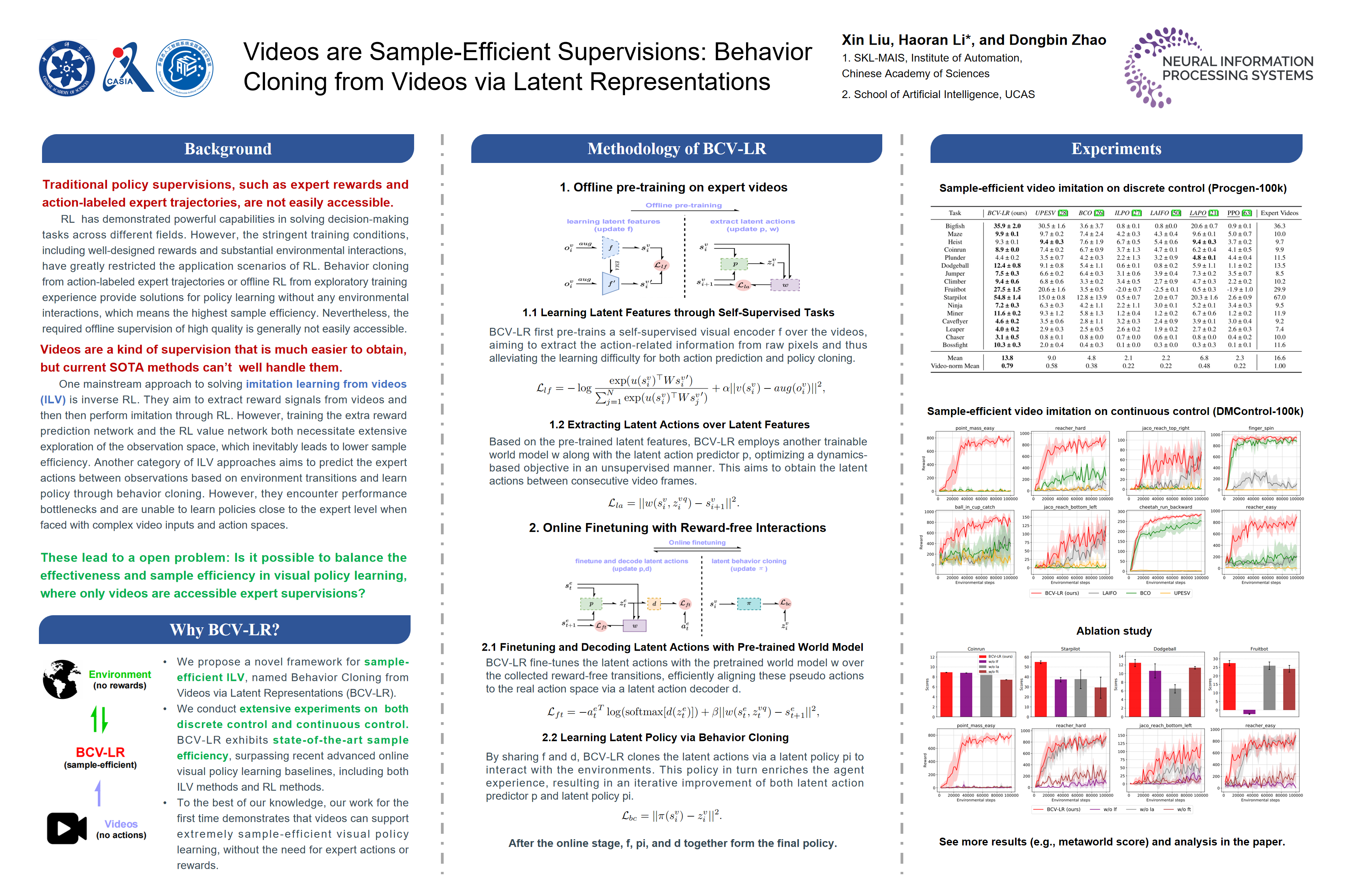 We conduct extensive experiments on a set of challenging visual tasks, including both discrete control and continuous control. BCV-LR enables effective (even expert-level on some tasks) policy performance with only a few interactions, surpassing state-of-the-art ILV baselines and reinforcement learning methods (provided with environmental rewards) in terms of sample efficiency across 24/28 tasks. To the best of our knowledge, this work for the first time demonstrates that videos can support extremely sample-efficient visual policy learning, without the need to access any other expert supervision.
