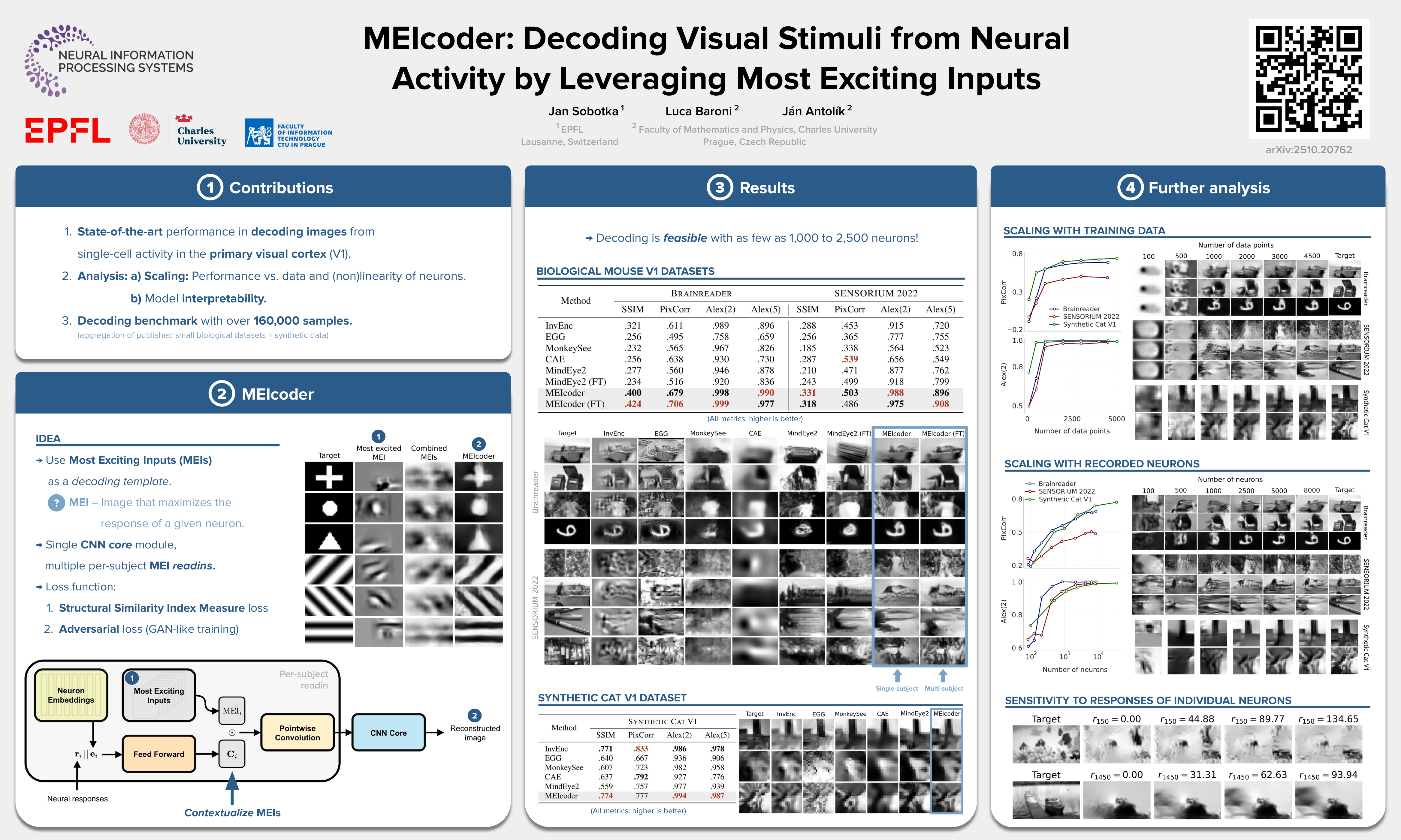 Using ablation studies, we demonstrate that MEIs are the main drivers of the performance, and in scaling experiments, we show that MEIcoder can reconstruct high-fidelity natural-looking images from as few as 1,000-2,500 neurons and less than 1,000 training data points. We also propose a unified benchmark with over 160,000 samples to foster future research.