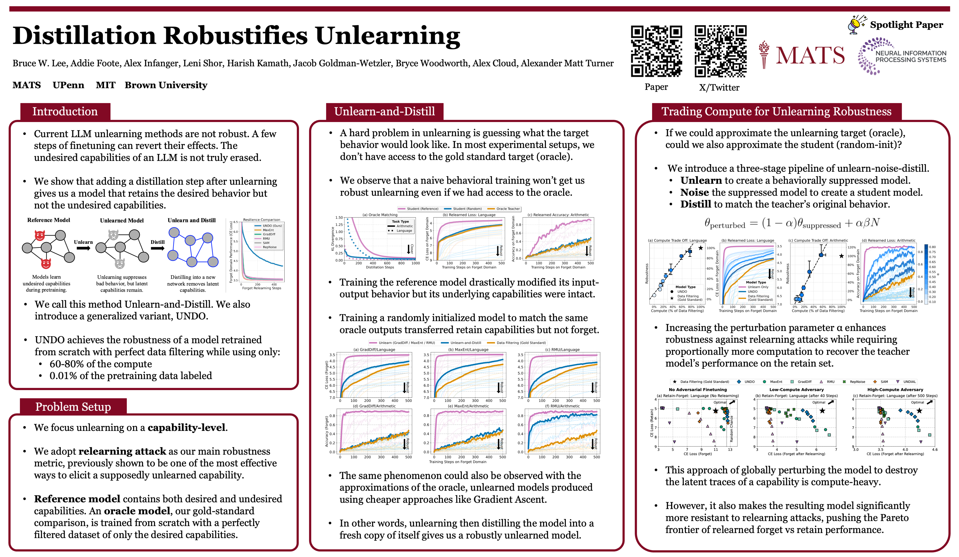 In light of this dynamic, we show our main result. Training a randomly initialized student on the outputs of an unlearned model transfers behaviors while leaving latent capabilities behind. In short, distillation robustifies unlearning. Based on this result, we propose Unlearn-Noise-Distill-on-Outputs (UNDO), a scalable method that distills an unlearned model into a noised copy of itself.