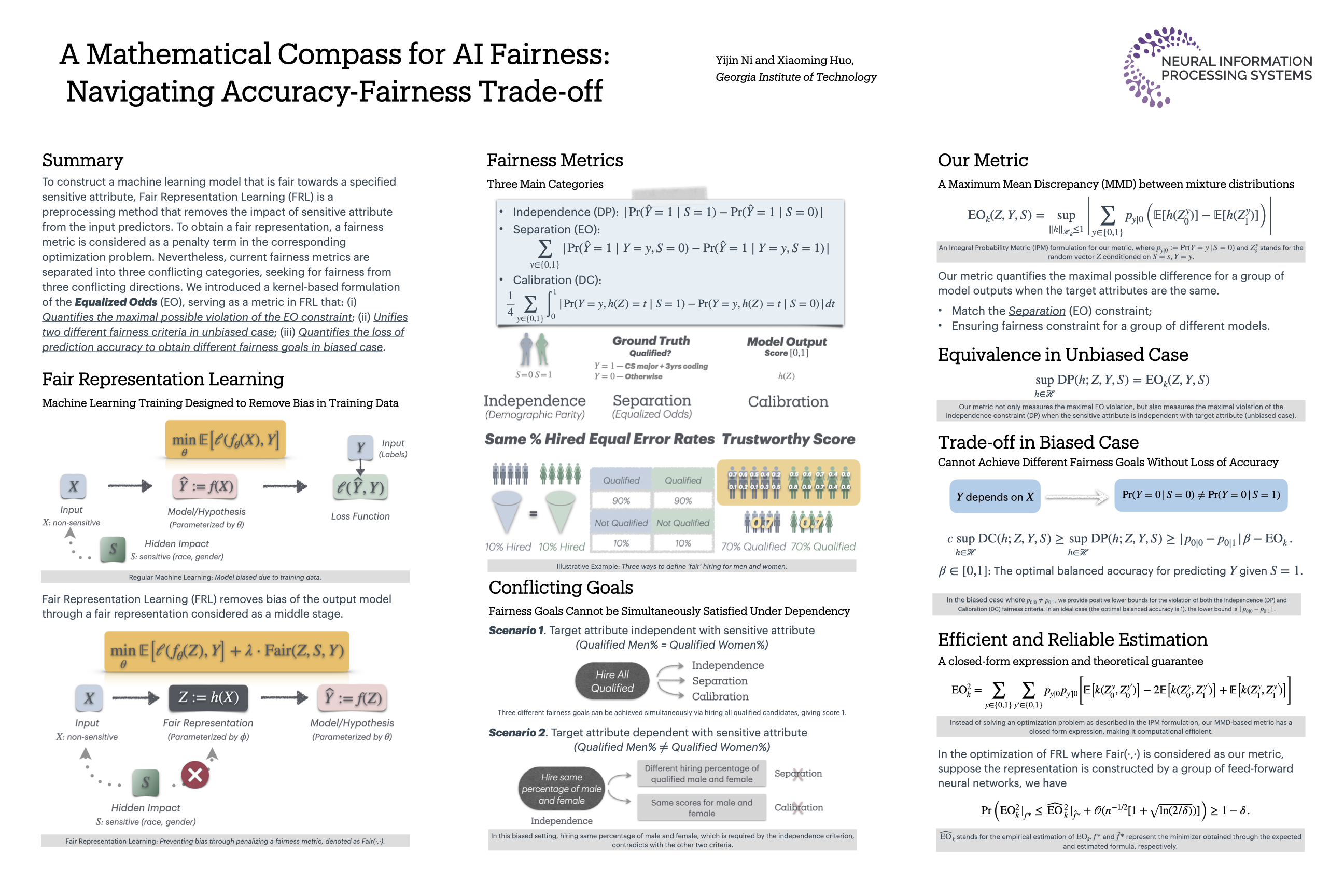 The central goal of FRL is to mitigate discrimination regarding a sensitive attribute while preserving prediction accuracy for the target variable . Our proposed criterion enables a rigorous and interpretable quantification of three core fairness objectives: independence (), separation—also known as equalized odds (), and calibration (). Under both unbiased () and biased () conditions, we show that satisfies both independence and separation in the former, and uniquely preserves predictive accuracy while lower bounding independence and calibration in the latter, thereby offering a unified analytical characterization of the tradeoffs among these fairness criteria.