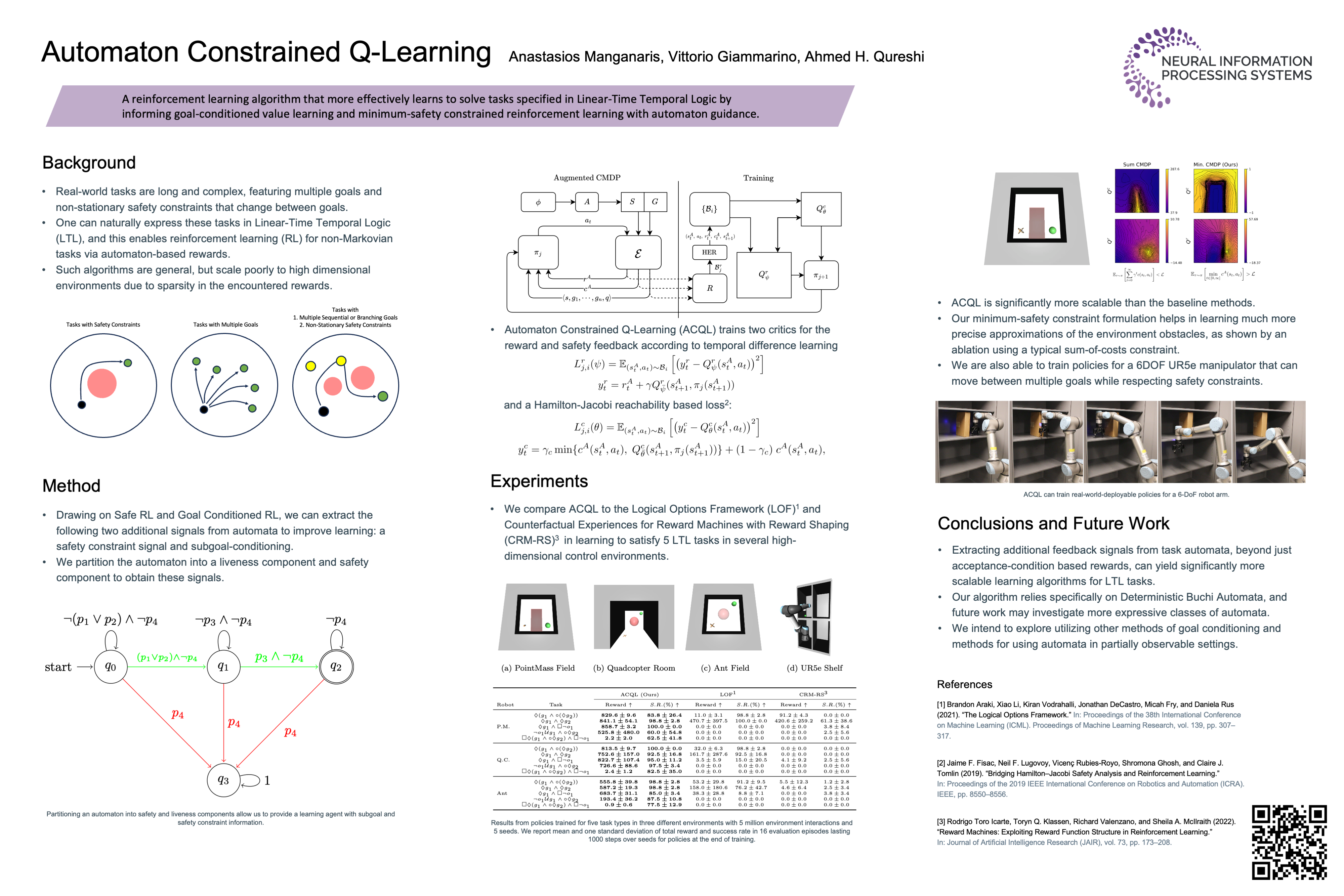 We show that ACQL outperforms existing methods across a range of continuous control tasks, including cases where prior methods fail to satisfy either goal-reaching or safety constraints. We further validate its real-world applicability by deploying ACQL on a 6-DOF robotic arm performing a goal-reaching task in a cluttered, cabinet-like space with safety constraints. Our results demonstrate that ACQL is a robust and scalable solution for learning robotic behaviors according to rich temporal specifications.