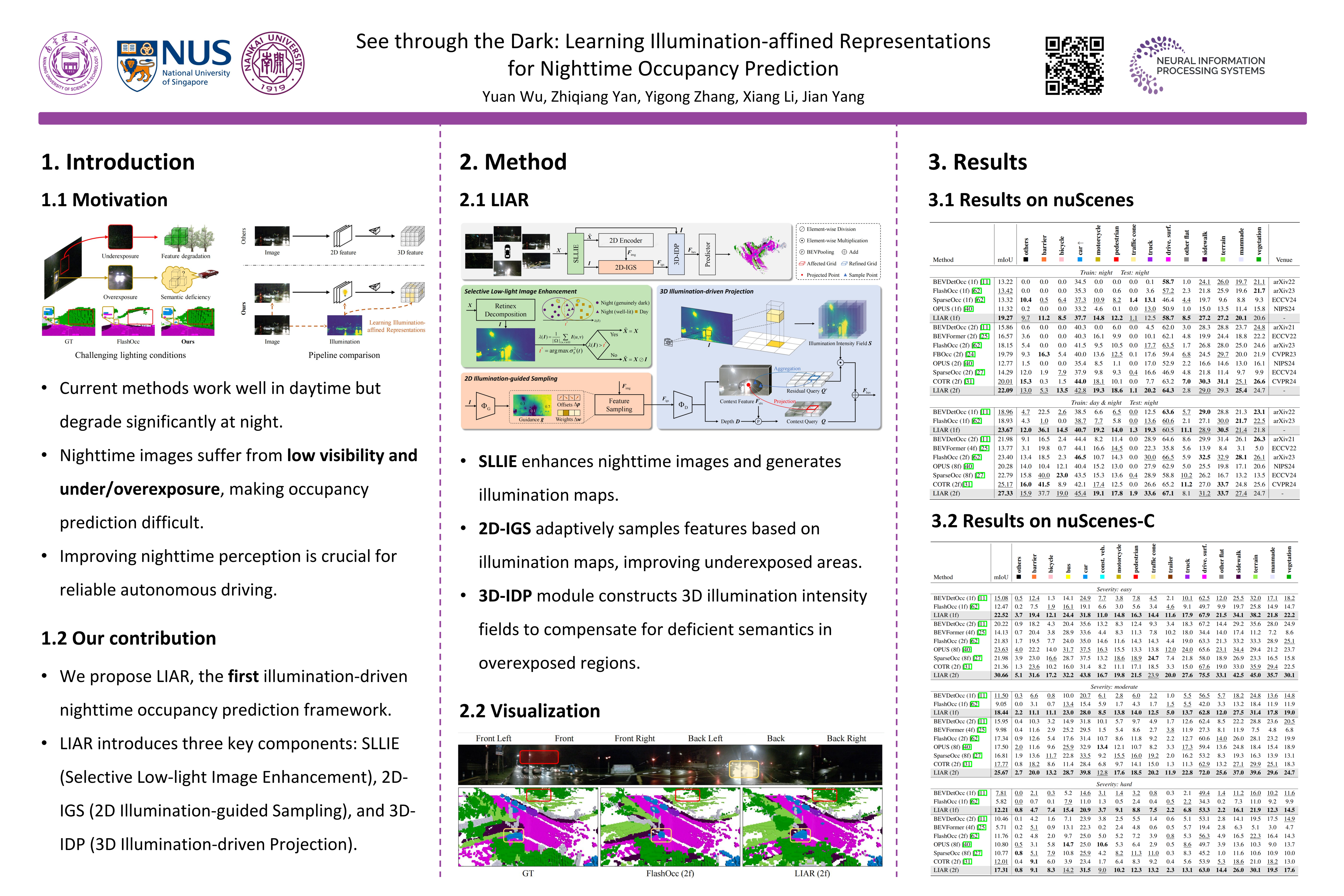 Building on the illumination maps generated by SLLIE, LIAR further incorporates two illumination-aware components: 2D Illumination-guided Sampling (2D-IGS) and 3D Illumination-driven Projection (3D-IDP), to respectively tackle local underexposure and overexposure. Specifically, 2D-IGS modulates feature sampling positions according to illumination maps, assigning larger offsets to darker regions and smaller ones to brighter regions, thereby alleviating feature degradation in underexposed areas. Subsequently, 3D-IDP enhances semantic understanding in overexposed regions by constructing illumination intensity fields and supplying refined residual queries to the BEV context refinement process.