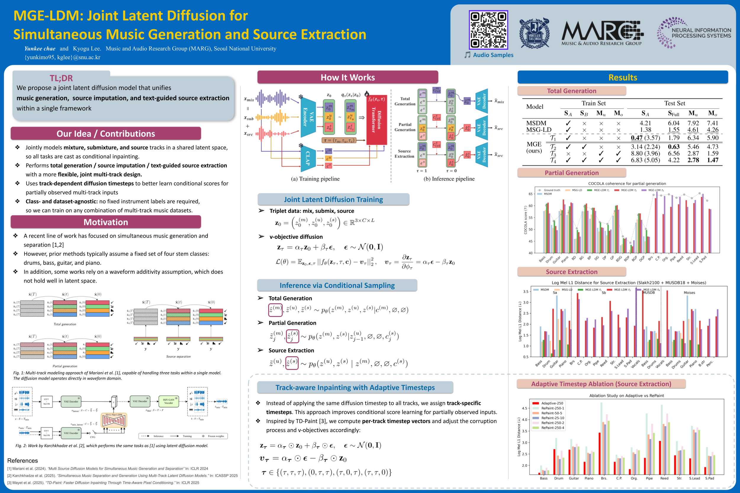 By formulating both separation and imputation as conditional inpainting tasks in the latent space, our approach supports flexible, class-agnostic manipulation of arbitrary instrument sources. Notably, MGE-LDM can be trained jointly across heterogeneous multi-track datasets (e.g., Slakh2100, MUSDB18, MoisesDB) without relying on predefined instrument categories.