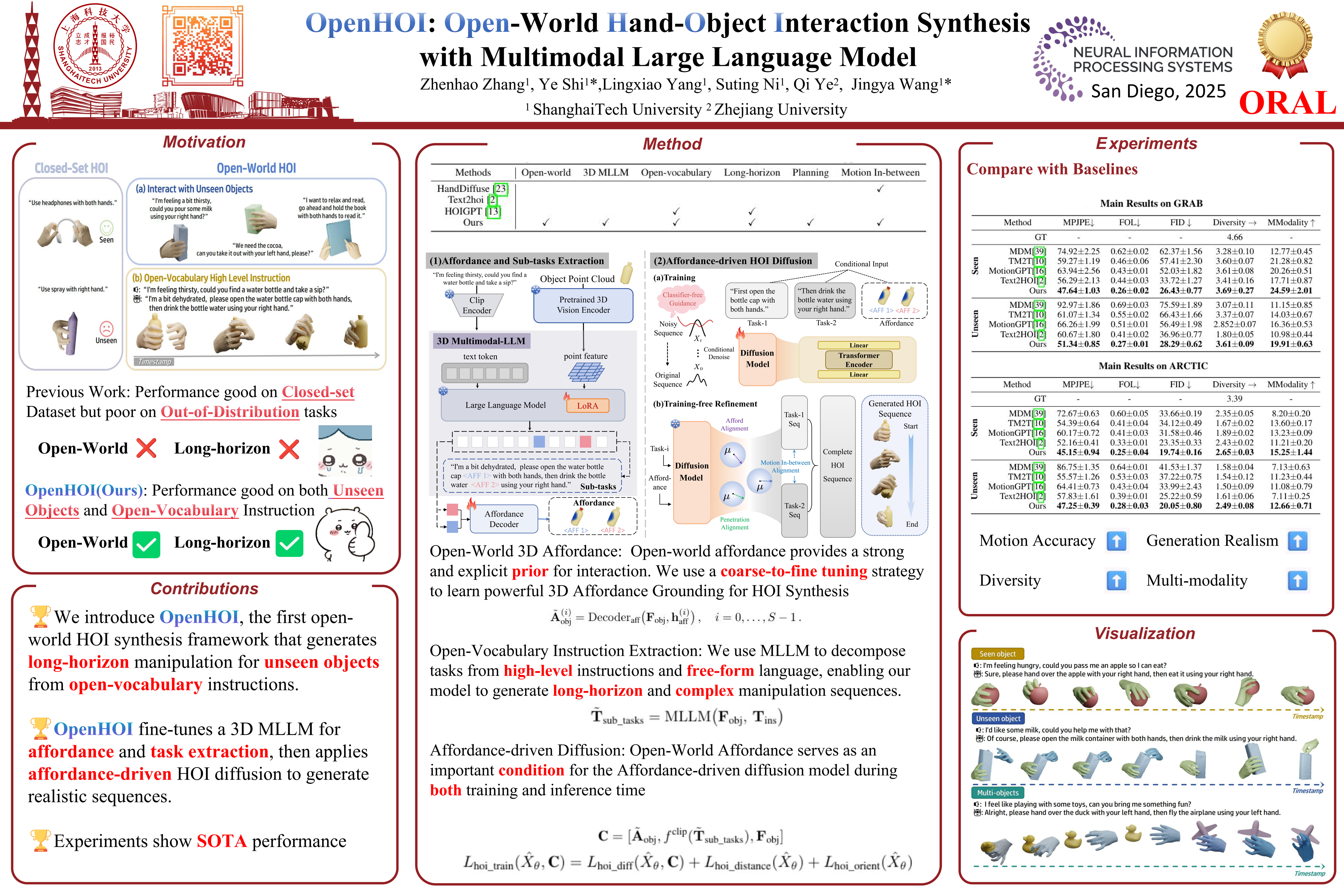 To synthesize physically plausible interactions, we propose an affordance-driven diffusion model paired with a training-free physics refinement stage that minimizes penetration and optimizes affordance alignment. Evaluations across diverse scenarios demonstrate OpenHOI’s superiority over state-of-the-art methods in generalizing to novel object categories, multi-stage tasks, and complex language instructions.